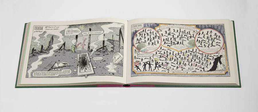 Le Livre de Léviathan mérite vraiment le terme d’ovni parmi les parutions actuelles de bande dessinée. Américain installé à Londres, Peter Blegvad est plasticien, musicien reconnu depuis les années 70 (avec Slapp Happy, Henry Cow, jouant avec Robert Wyatt, Fred Frith ou John Greaves), et président de l’Institut Londonien de ‘Pataphysique. C’est en autodidacte qu’il a abordé la bande dessinée avec ce Léviathan qui fut d’abord un strip hebdomadaire dans The Independent, où chaque semaine, Blegvad innovait et expérimentait à la manière des premiers maîtres du XXᵉ Siècle : on pense à Mc Cay ou à Herriman plus qu’à un livre paru en Angleterre en 2000 et maintenant traduit en Français par Claro. Léviathan, bébé sans visage à l’imaginaire et aux raisonnements philosophiques insoupçonnables par son entourage, est un prétexte à des variations thématiques et graphiques d’une audace rare, d’un humour insolite et d’une poésie confondante.